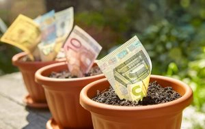 Rolled and stuck money bills in flowerpots