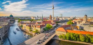 Berlin skyline with Spree river at sunset, Germany