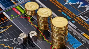 Dices cubes with the words SELL BUY, downtrend stacks of golden