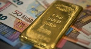 Ein Goldbarren und Geldscheine in einem Schliessfach im Tresor des Goldhandels Pro Aurum Muenchen 1
