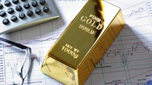Gold bullion barr on a stocks and shares chart