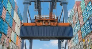Shore crane lifts container during cargo operation in port